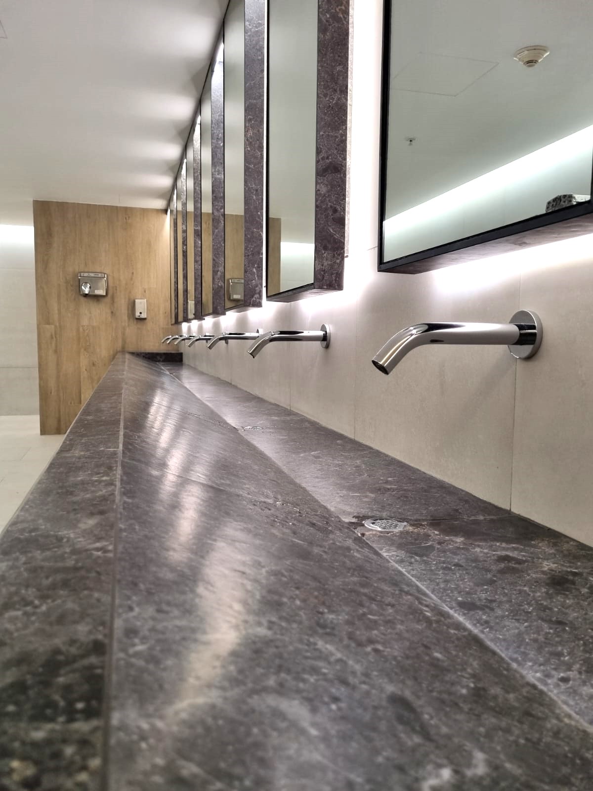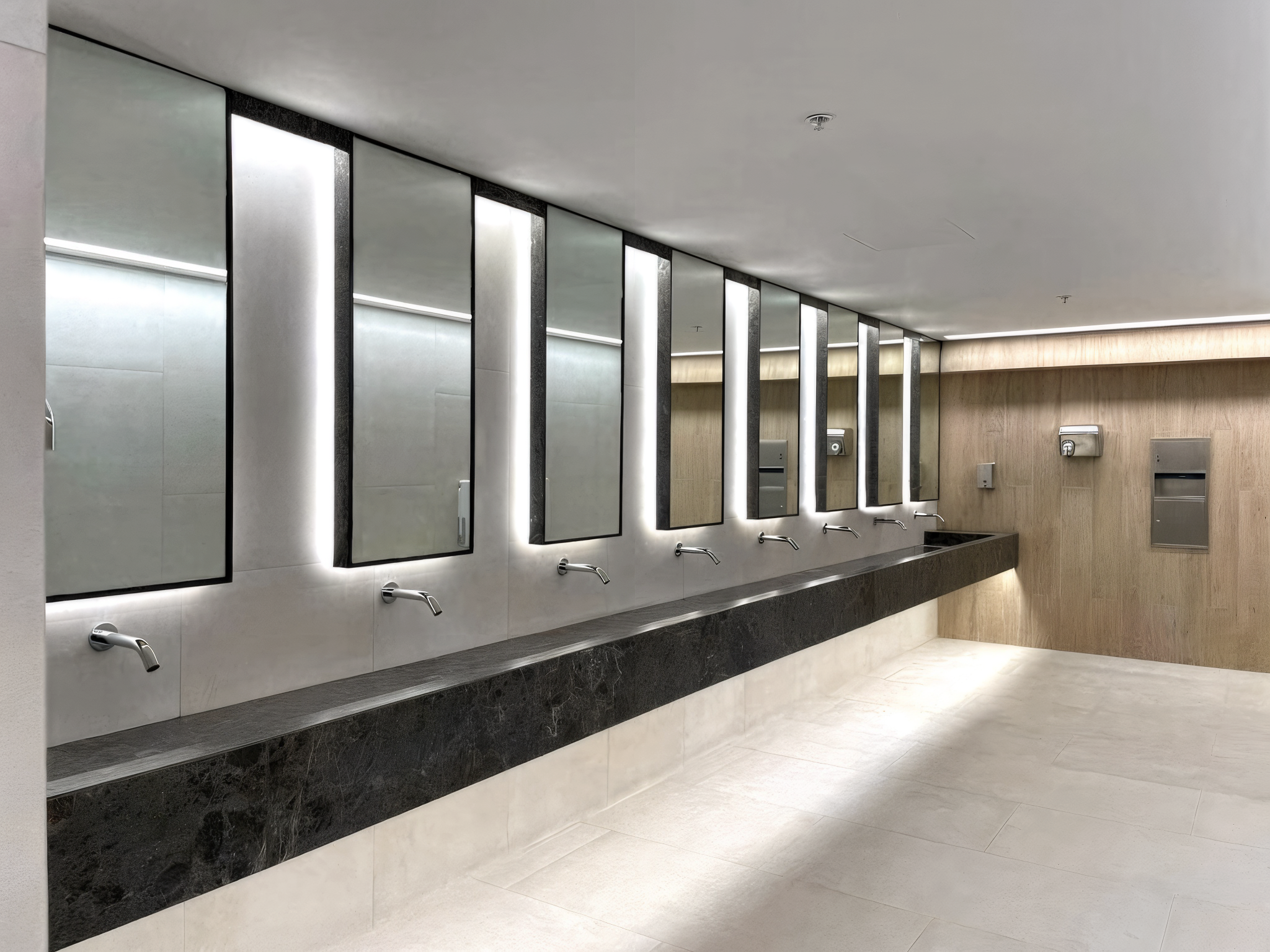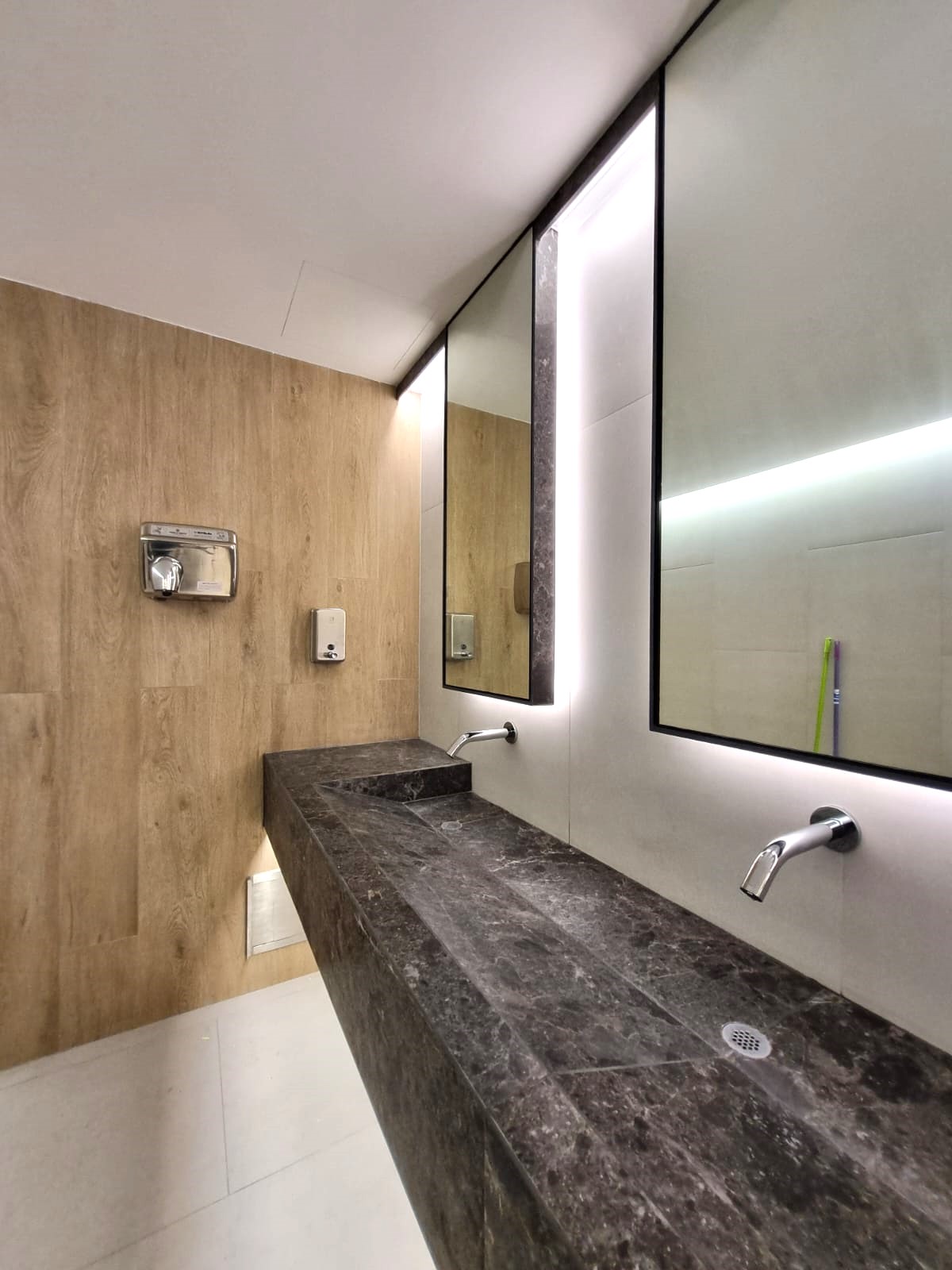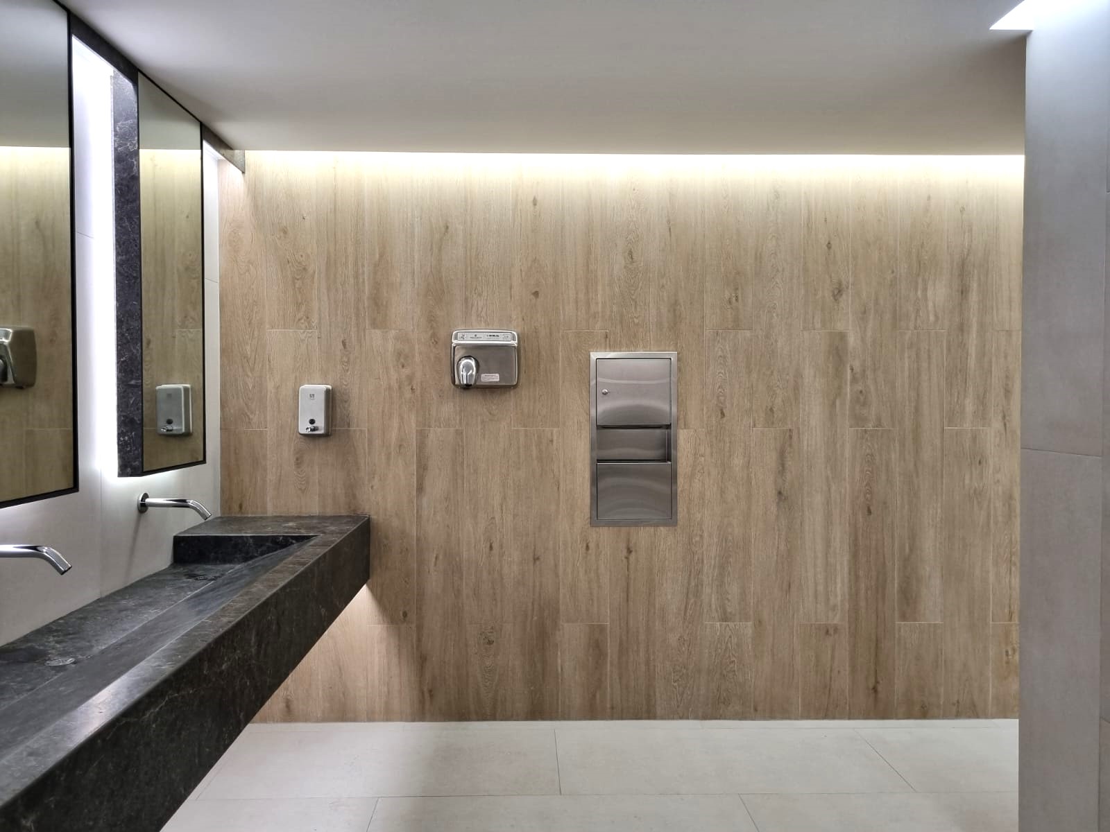 El proyecto transformó los baños del centro comercial en espacios modernos y sofisticados, combinando materiales elegidos cuidadosamente en una mezcla que aporta calidez, durabilidad y un carácter con líneas limpias en su expresión. La iluminación indirecta resalta las texturas, generando un ambiente acogedor, elegante y confortable para los usuarios.