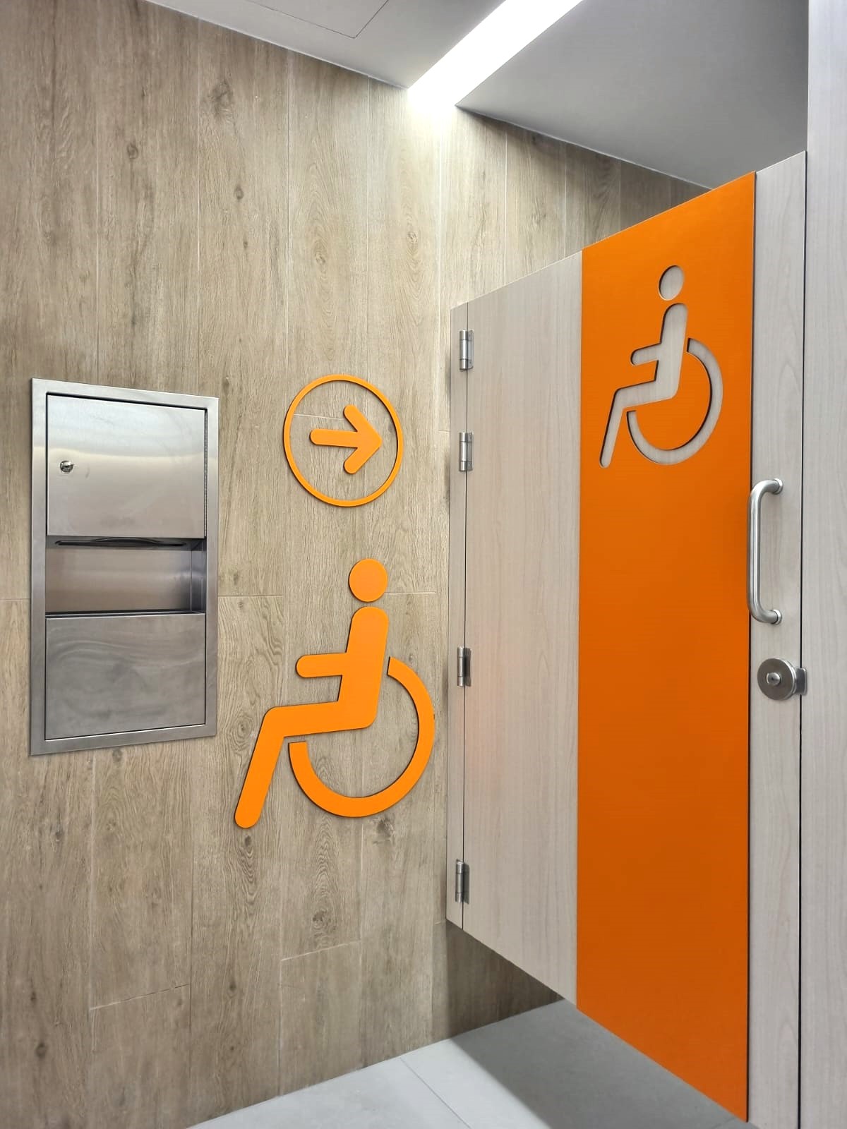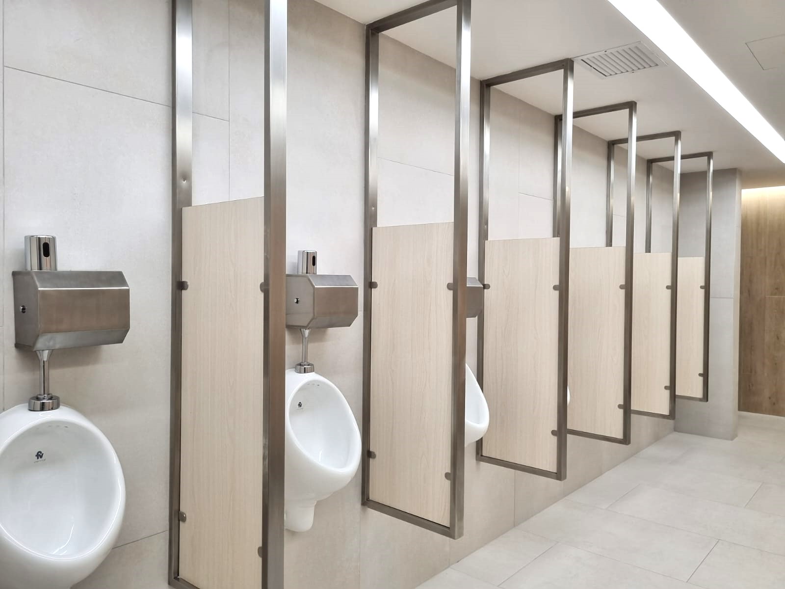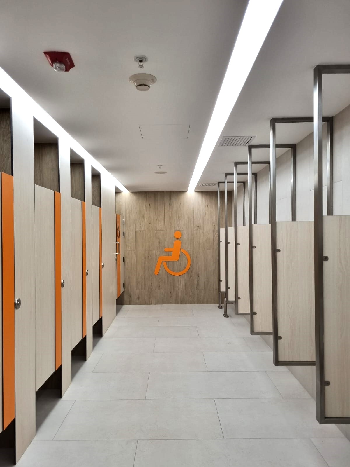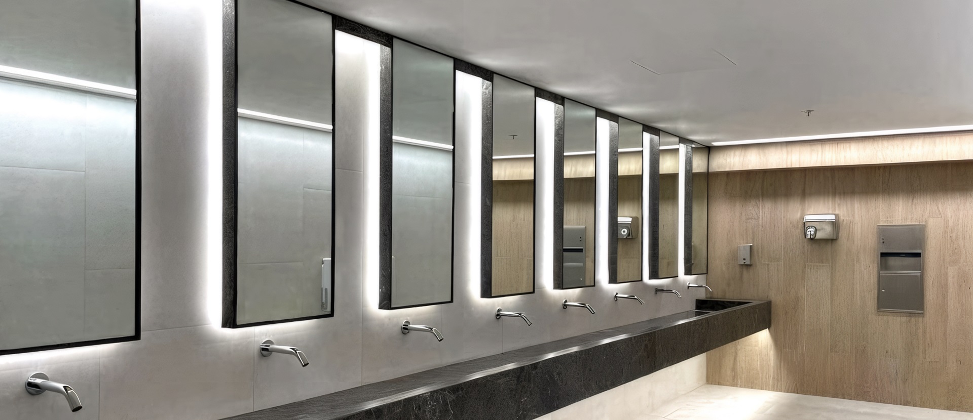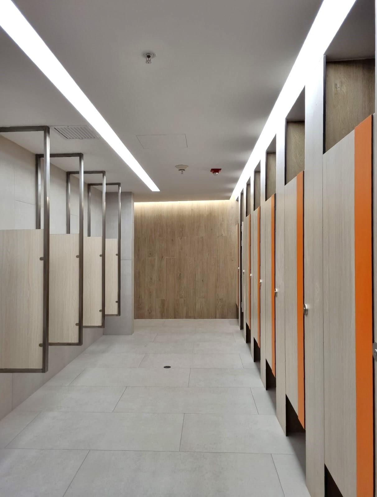 El proyecto transformó los baños del centro comercial en espacios modernos y sofisticados, combinando materiales elegidos cuidadosamente en una mezcla que aporta calidez, durabilidad y un carácter con líneas limpias en su expresión. La iluminación indirecta resalta las texturas, generando un ambiente acogedor, elegante y confortable para los usuarios.