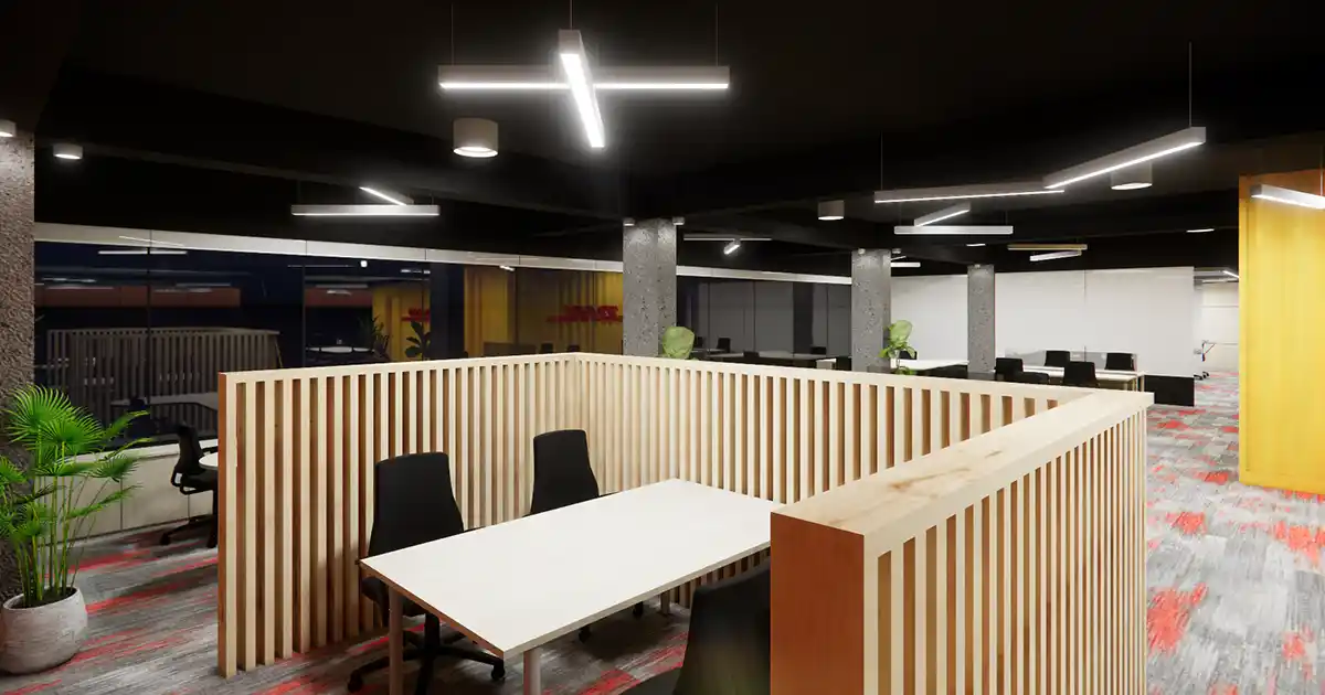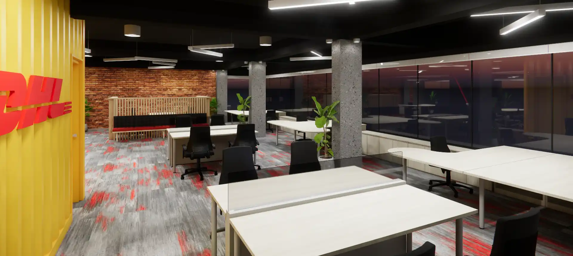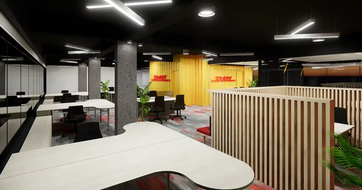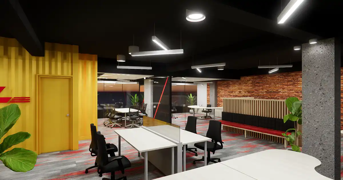 La oficina de DHL fue concebida como un entorno moderno y vibrante que transmite la esencia de la marca: dinamismo, energía y confianza. El diseño integra áreas clave como gerencia, salas de reunión y oficinas privadas, logrando un balance entre espacios abiertos que fomentan la colaboración y zonas privadas que aseguran concentración, confidencialidad y enfoque de los usuarios. La identidad visual de la compañía se plasma en los colores, materiales y detalles empleados en cada rincón.