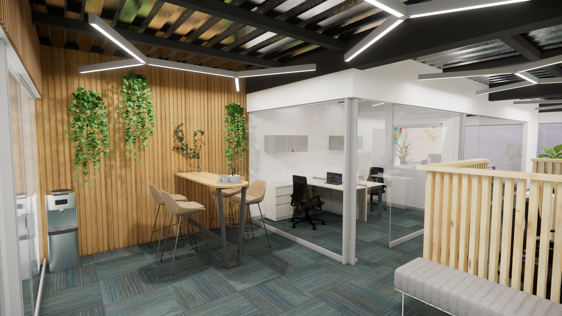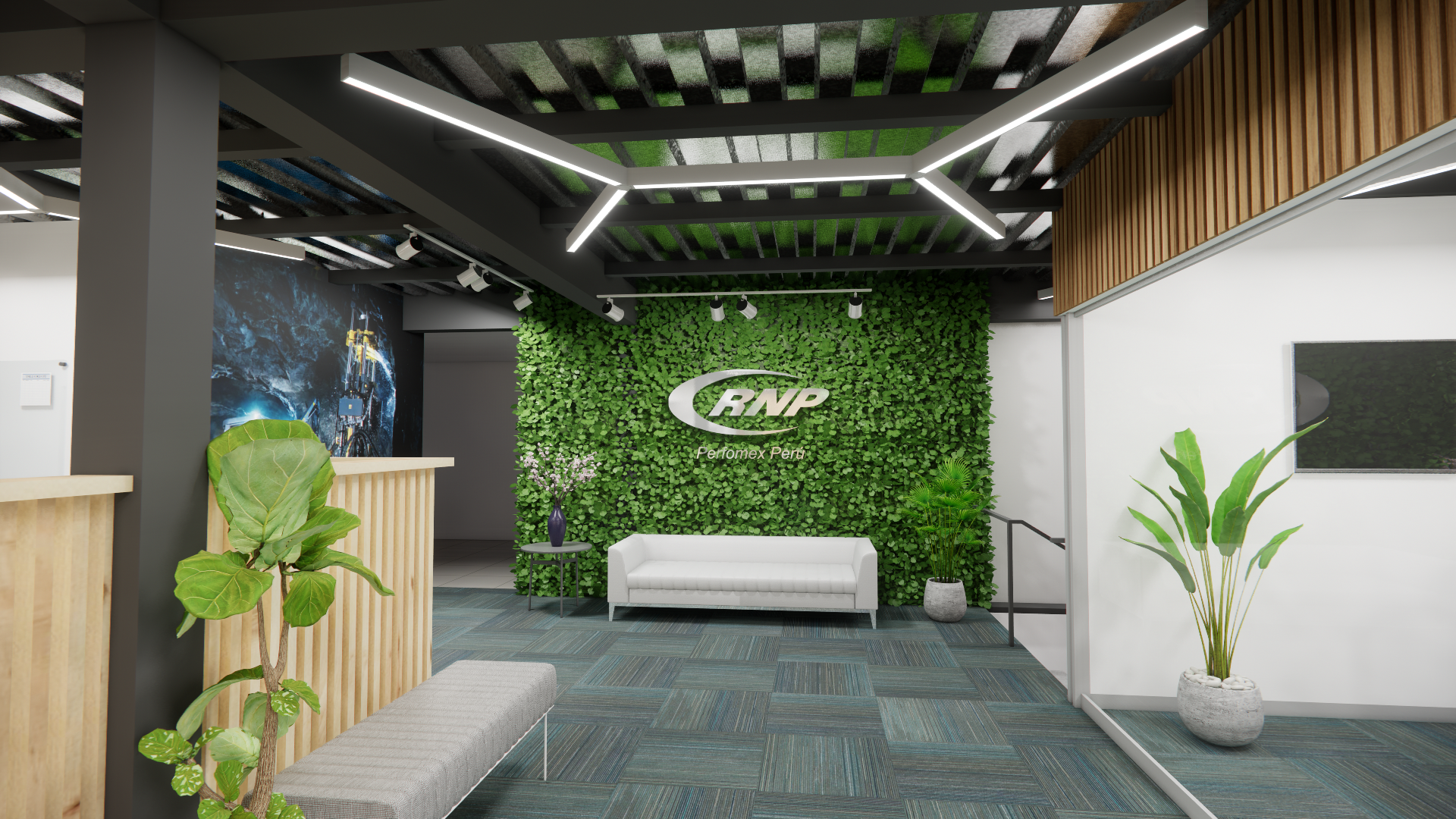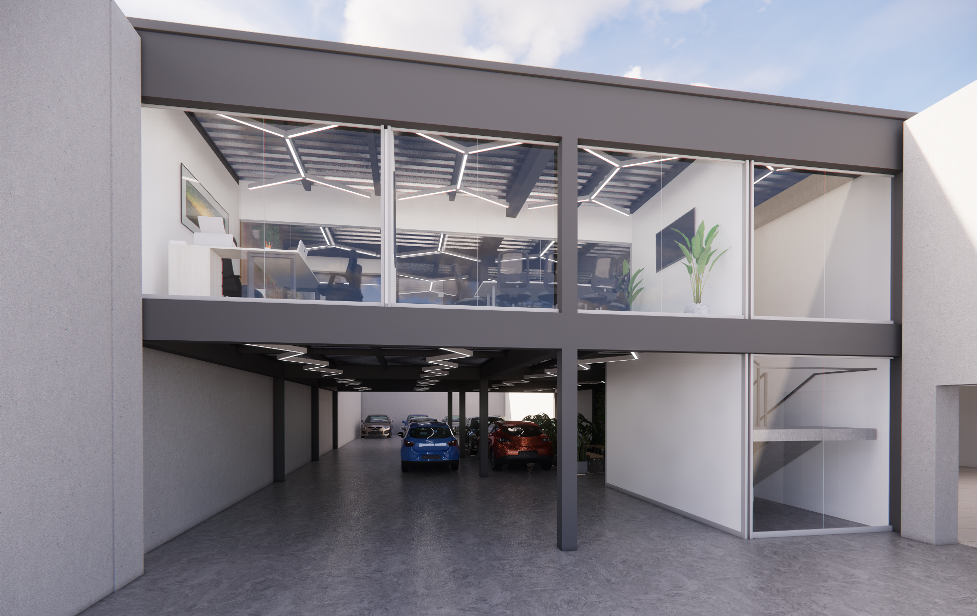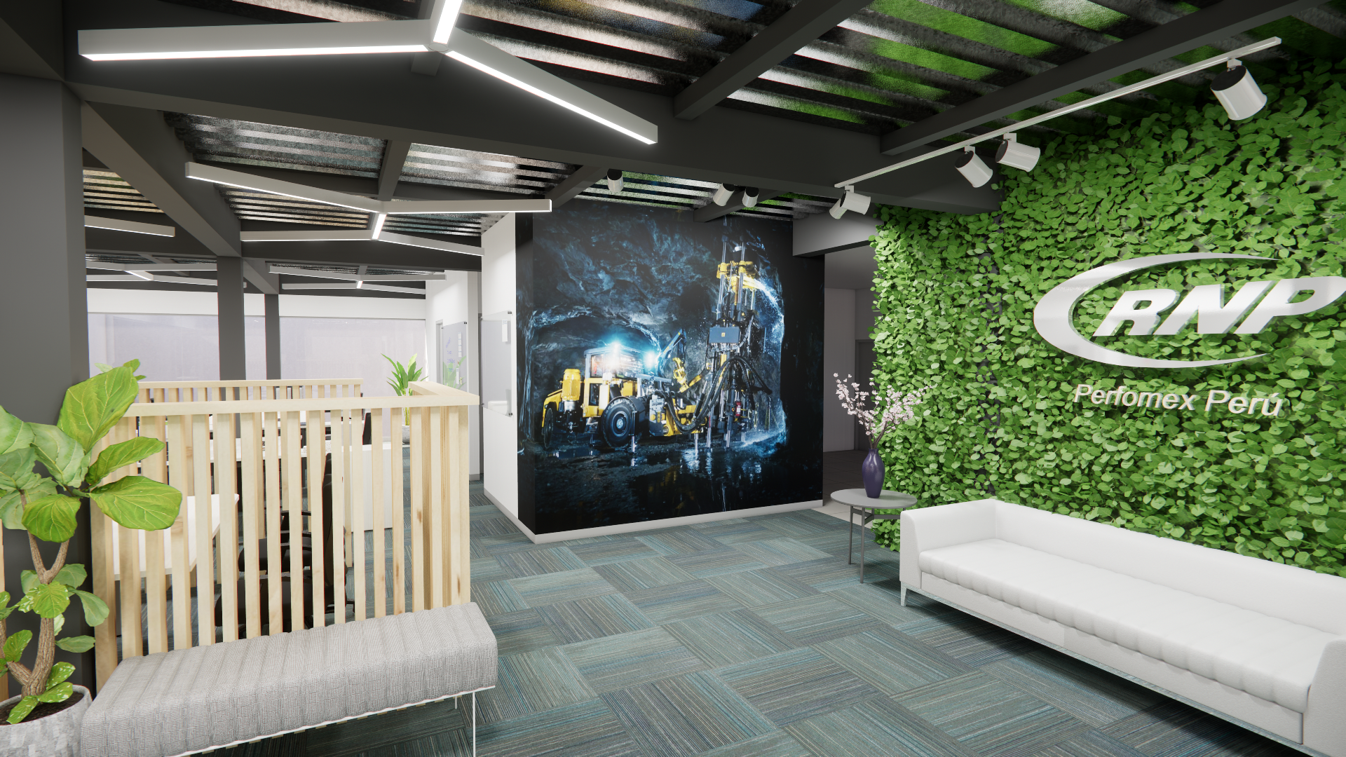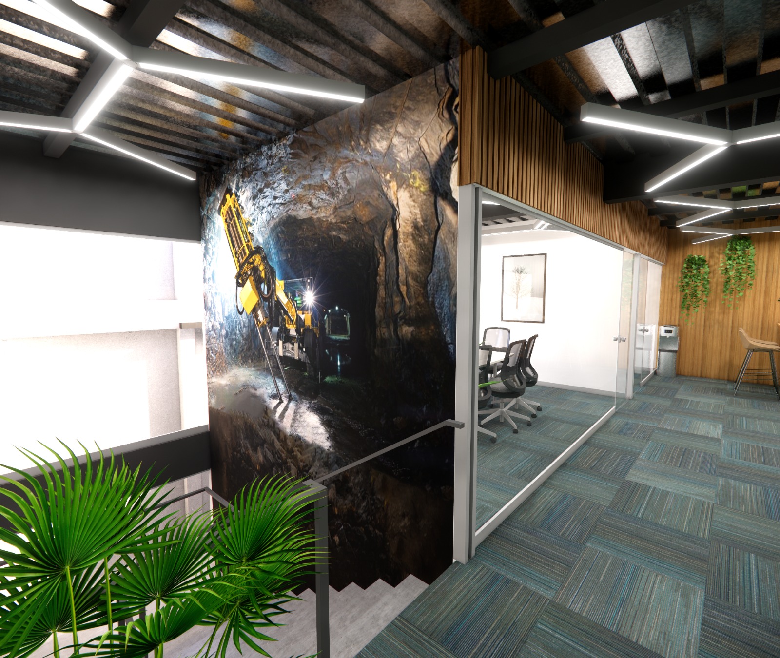 El primer nivel, concebido como planta libre, se destinó a estacionamientos, mientras que el segundo nivel concentra las oficinas administrativas en un entorno cómodo y eficiente. El recorrido entre ambos niveles se convierte en una experiencia inmersiva: gracias a la gigantografía de un socavón y una perforadora, que al circular por ella transmite la sensación de adentrarse en la esencia de la actividad minera o rubro al que se dedica la empresa, generando un vínculo entre la operación minera y el ámbito administrativo.