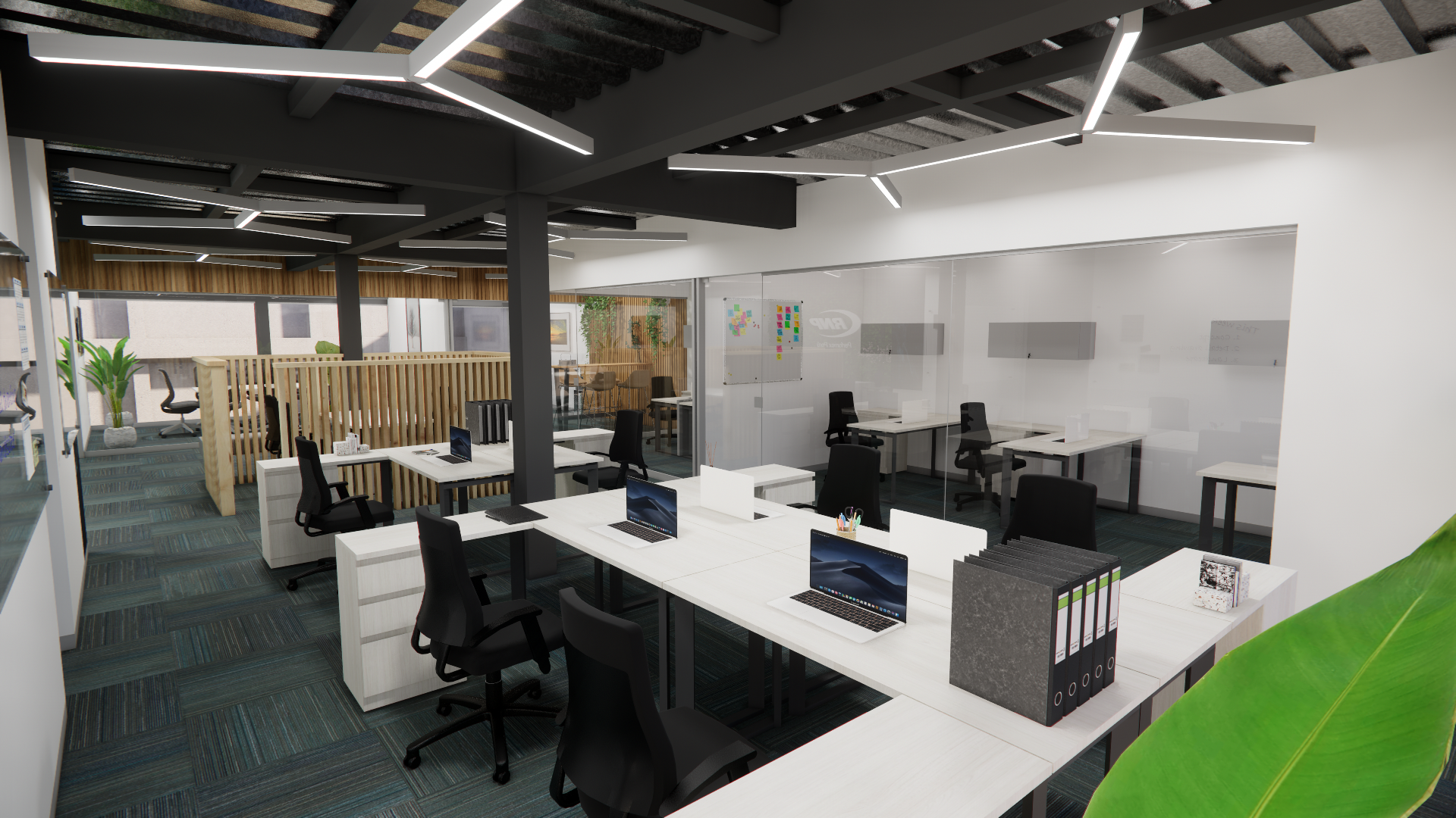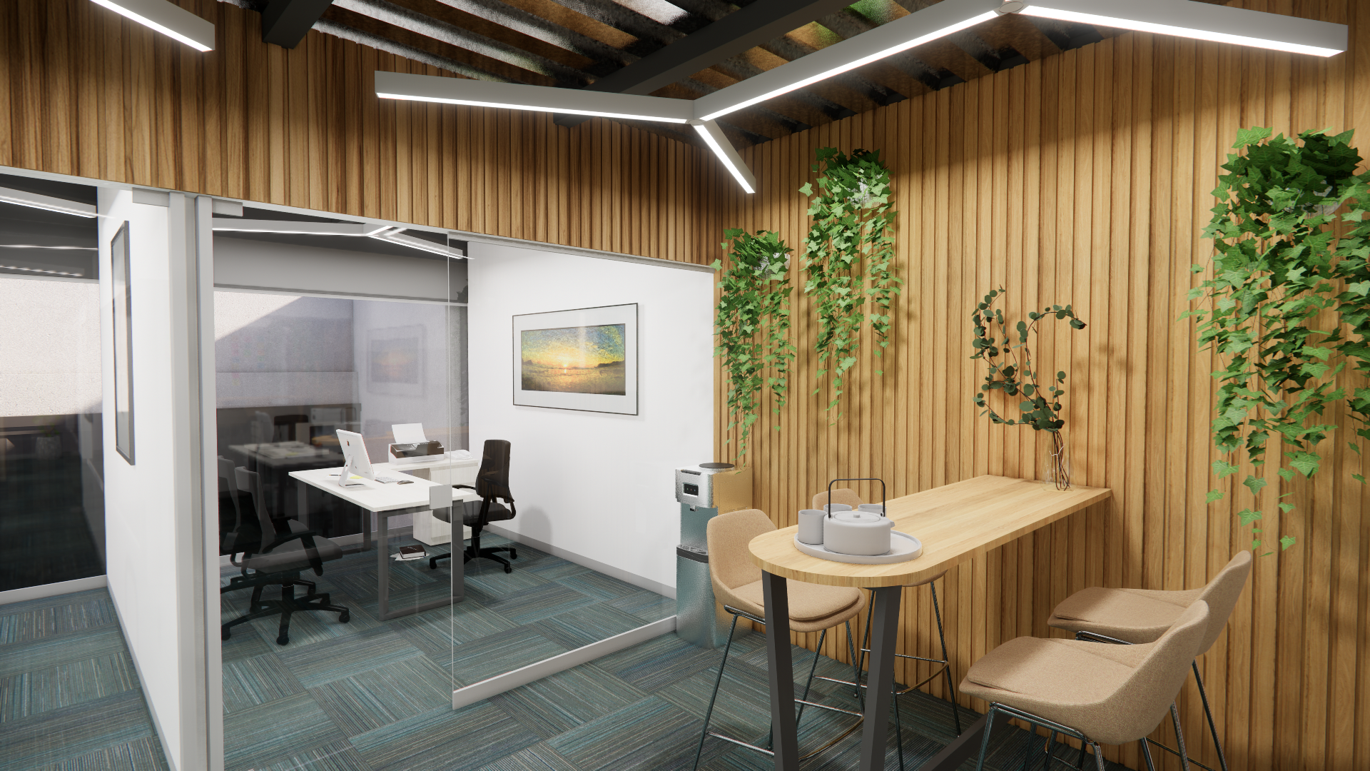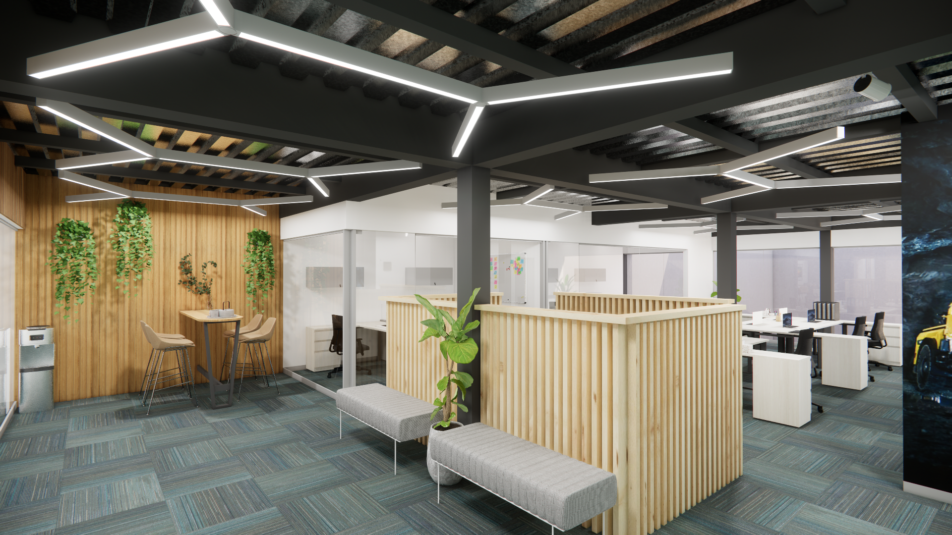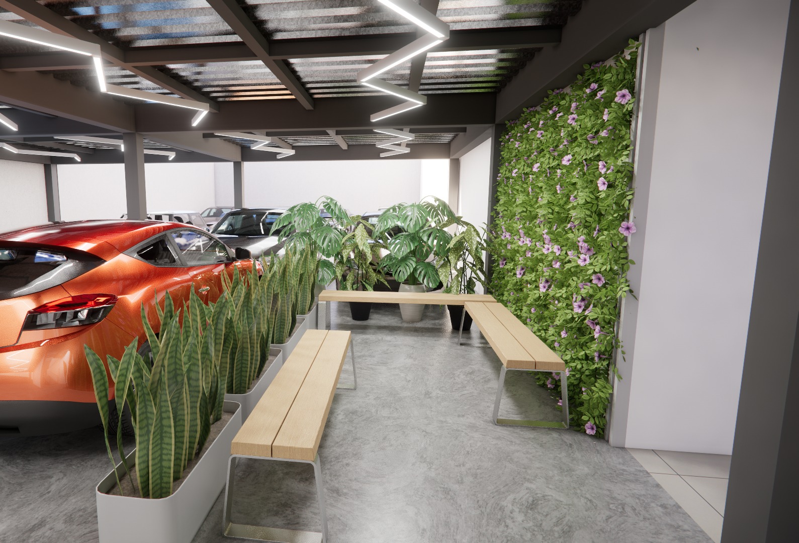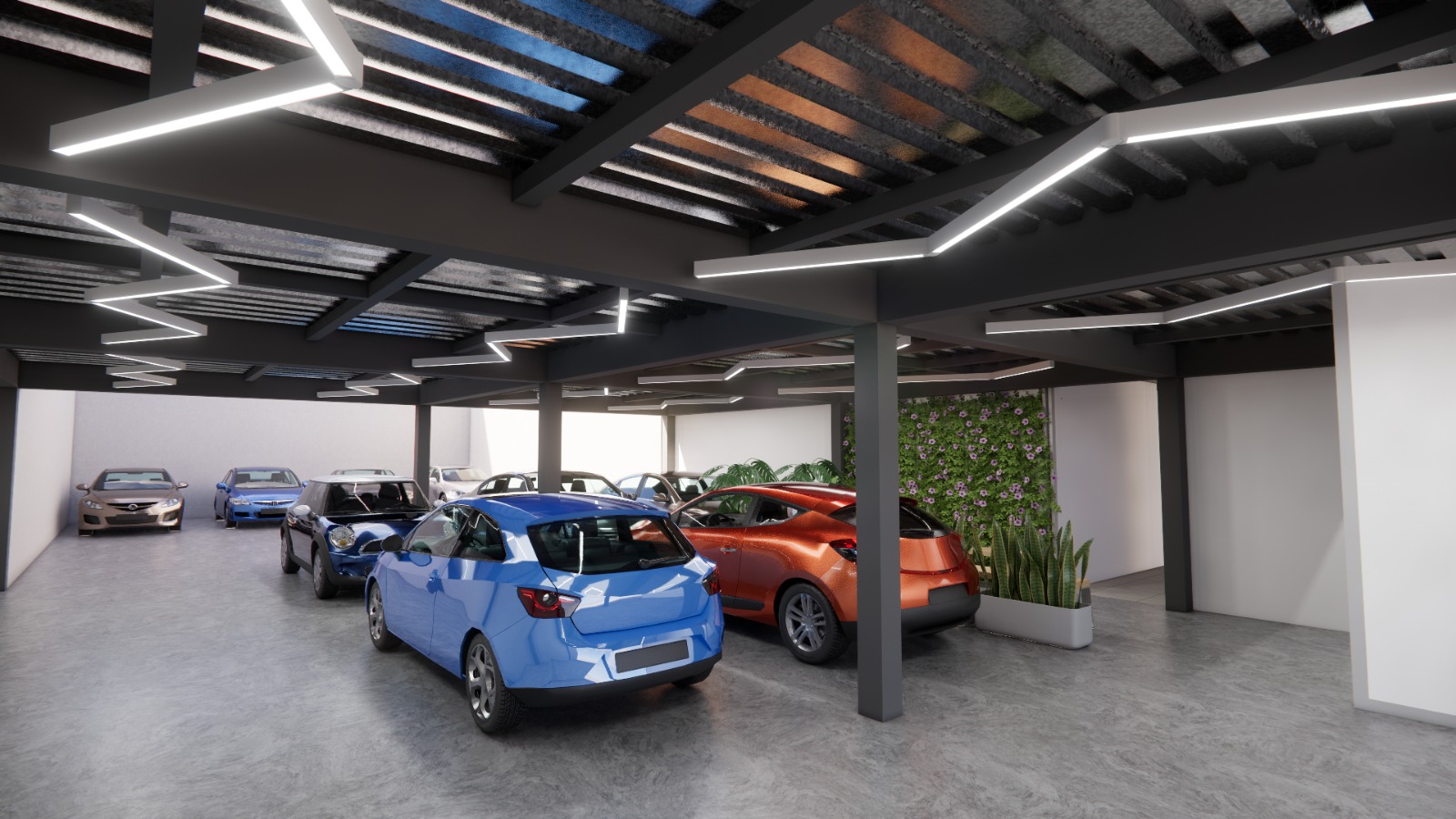 El primer nivel, concebido como planta libre, se destinó a estacionamientos, mientras que el segundo nivel concentra las oficinas administrativas en un entorno cómodo y eficiente. El recorrido entre ambos niveles se convierte en una experiencia inmersiva: gracias a la gigantografía de un socavón y una perforadora, que al circular por ella transmite la sensación de adentrarse en la esencia de la actividad minera o rubro al que se dedica la empresa, generando un vínculo entre la operación minera y el ámbito administrativo.